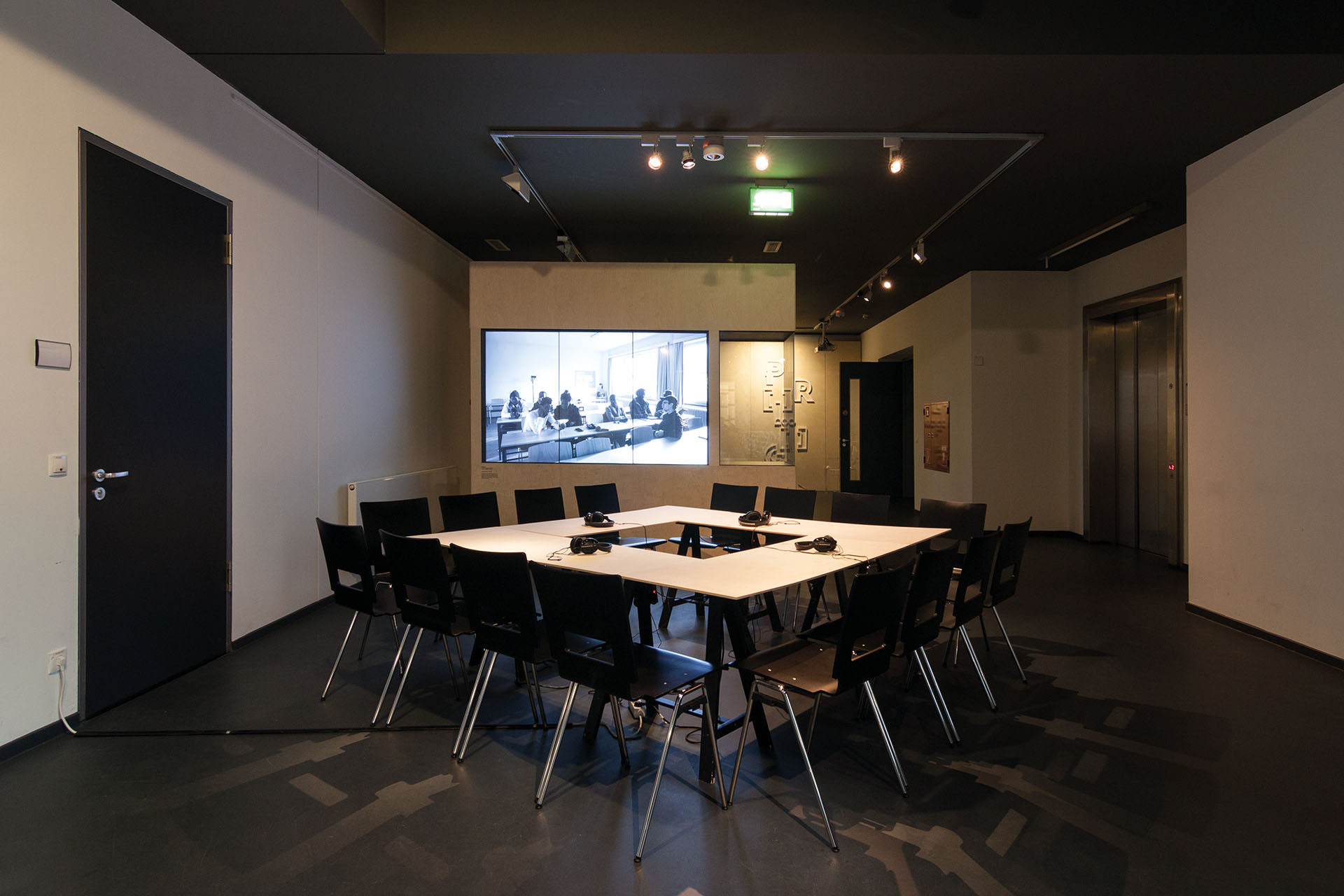 As part of the group exhibition Megalopolis - Voices from Kinshasa at the GRASSI Museum Leipzig, a joint tour with the participating artists of the places associated with the reception history of Lumumba took place. The group discussions on site were presented in video tableaux based on historical photographs. In these, the original hierarchy in the image space is questioned by the presence of the protagonists and is overwritten by the current discussions both visually and in terms of content. The video installation Revisits was presented for the first time as part of another round table talk next to the exhibition space. After the talk, the second part of the event was followed by a public choir rehearsal, in which a Leipzig choir rehearsed an excerpt from the original score of Paul Dessau's Requiem. Credits: 1 Revisits, video still, video, 17 min. loop, UHD, b/w, without audio, Camera: Frank Holbein, Participants: Steve Bandoma, Zoe Bella, Chérie Benga, Serge Diakota, Eddy Ekete, Eunice Kamanda, Dolet Malalu, Carsten Saeger, Theo Schley, Flory Sinanduku, 2019, open space in front of the former Herder Institute with the Lumumumba bust by Jenny Mucchi-Wiegmann, rebuilt in 2011 (Video still: Frank Holbein) 2 Exhibition view, foyer, 4-channel audio installation, various recordings in a loop, 4 stereo headphones, media player, table installation, 3-channel video installation Revisits on media wall with showcase, GRASSI Museum für Völkerkunde zu Leipzig, in cooperation with the exhibition Megalopolis – Voices from Kinshasa, 2019 (Photo: Carsten Saeger) 3 View, public rehearsal on 17.01.2019, Vocalconsort Leipzig, Conductor: Franziska Kuba, Piano: Philip Frischkorn, Sound: Jakob Limmer, Museumspädagogischer Raum, GRASSI Museum für Völkerkunde zu Leipzig, 2019 (Photo: Carsten Saeger)